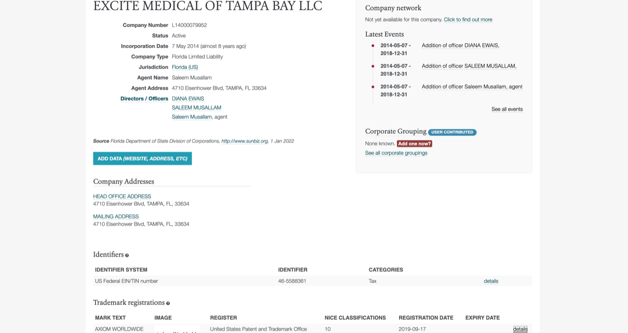 | 8b | FDA listing showing Excite Medical headed by former Axiom employee Musallam, as a registered establishment for the same 510k number (K060735). [Note: 510k database search does not turn up any 510k application for Excite Medical (12/16/19); however, FDA regulation doesn’t allow two manufacturers on one 510k.] | FDA Database – Same number used by Excite |